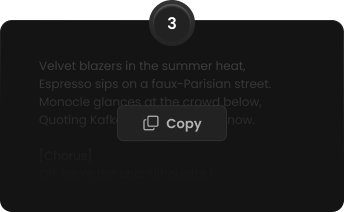 为您的旋律或社交媒体帖子即时获取免费歌词。生成后,只需复制歌词,即可在您的歌曲创作、音乐制作或创意项目中立即使用。